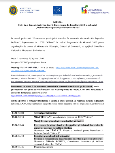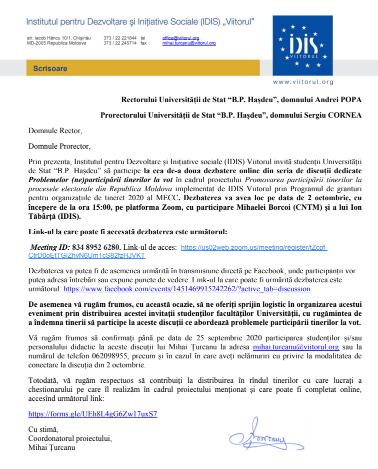 Domnule Rector, Domnule Prorector, Prin prezenta, Institutul pentru Dezvoltare și Inițiative sociale (IDIS) Viitorul invită studenții Universității de Stat “B.P. Hașdeu” să participe la cea de-a doua dezbatere online din seria de discuții dedicate Problemelor (ne)participării tinerilor la vot în cadrul proiectului Promovarea participării tinerilor la procesele electorale din Republica Moldova implementat de IDIS Viitorul prin Programul de granturi pentru organizațiile de tineret 2020 al MECC. Dezbaterea va avea loc pe data de 2 octombrie, cu începere de la ora 15:00, pe platforma Zoom, cu participare Mihaelei Borcoi (CNTM) și a lui Ion Tăbârță (IDIS).