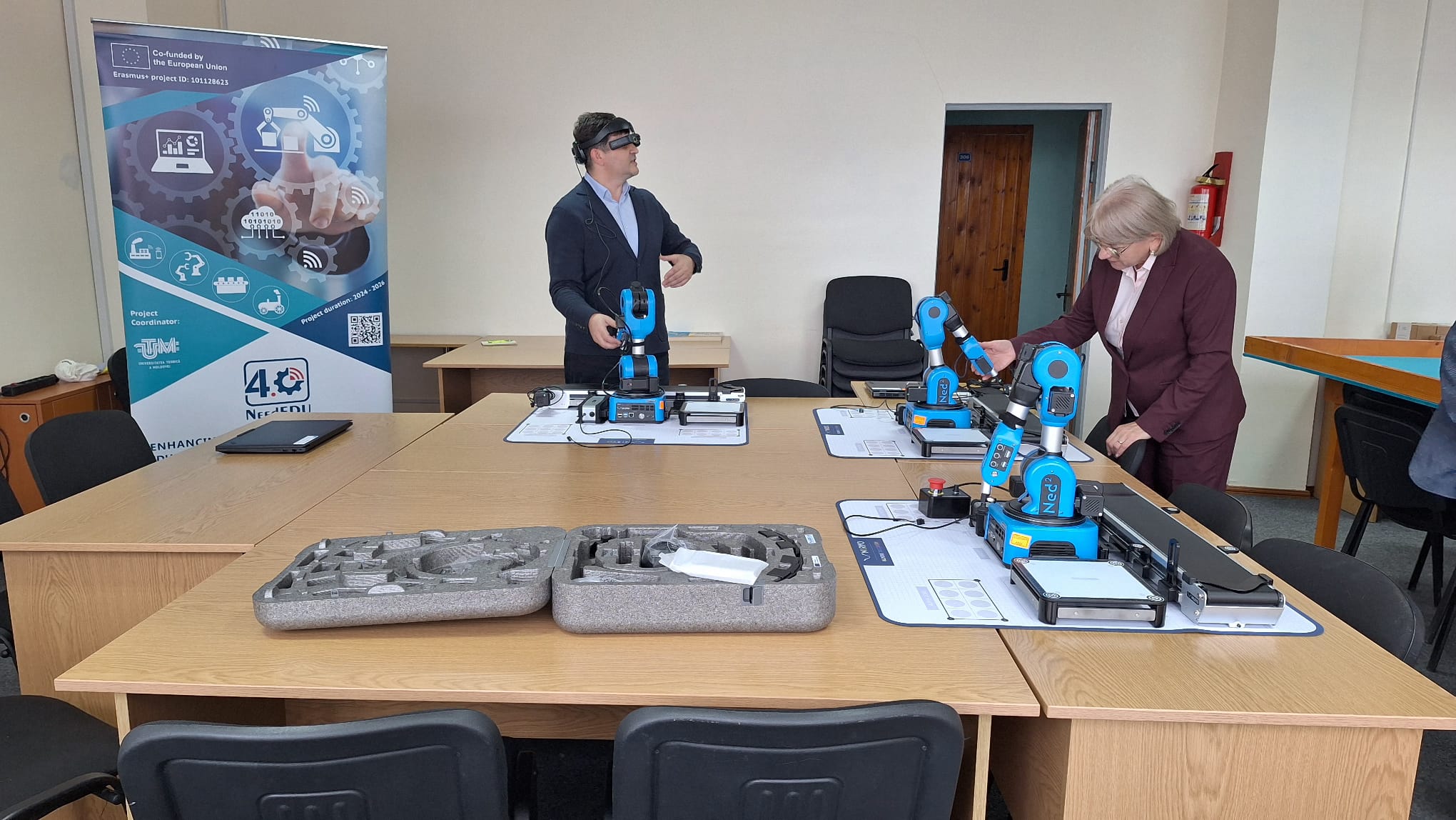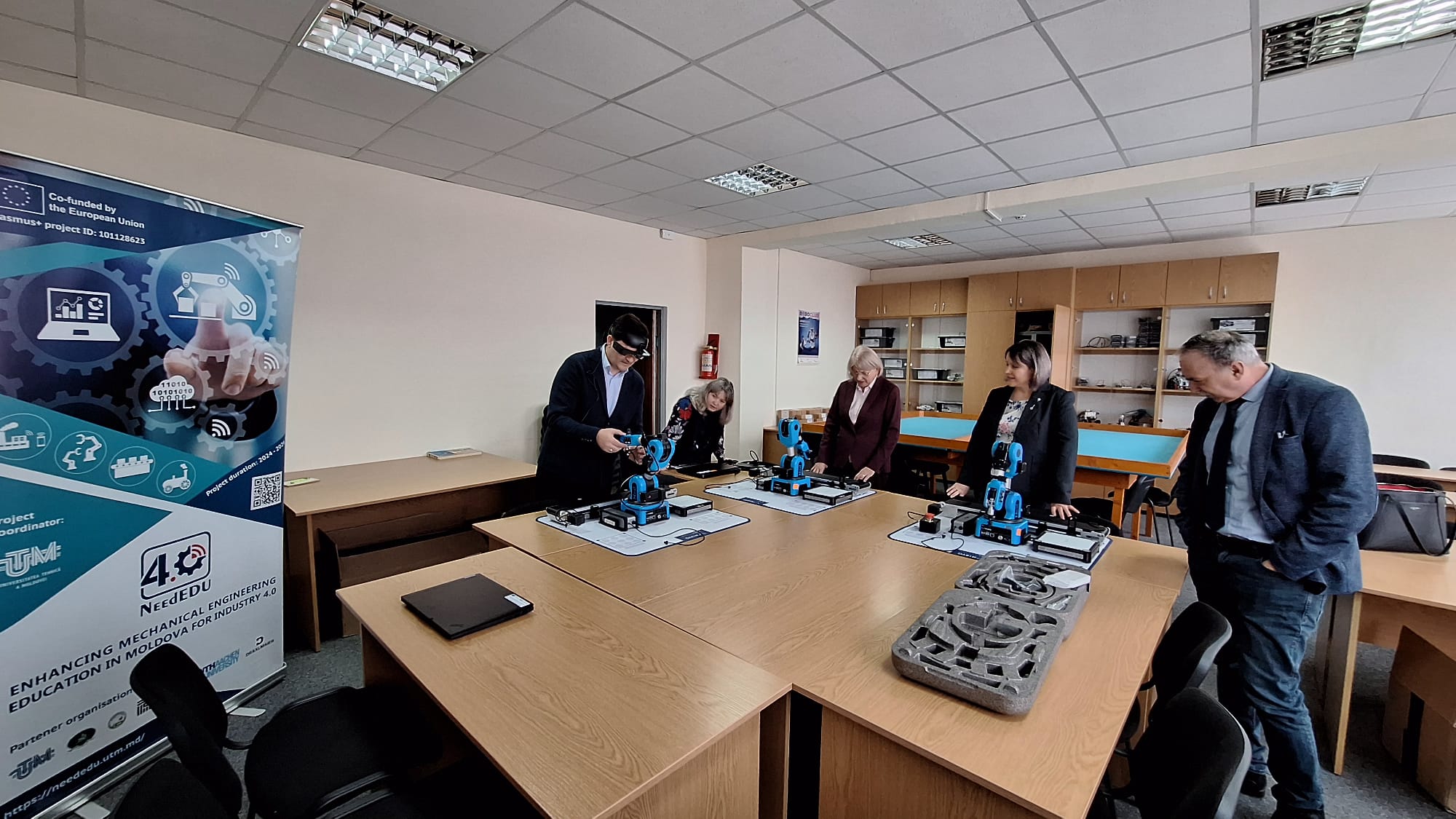 Totodată, a fost realizată evaluarea echipamentelor achiziționate în cadrul proiectului, destinate modernizării infrastructurii educaționale, printre care: seturi de robotică colaborativă, tablă interactivă, laptopuri performante și ochelari inteligenți de realitate augmentată (AR).
