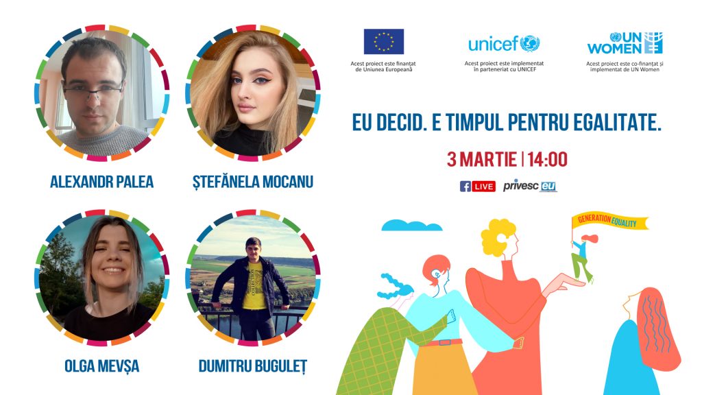 Această discuție a fost desfășurată de UN Women Moldova în cadrul proiectului EVA, „Promovarea egalității de gen în raioanele Cahul și Ungheni”, finanțat de Uniunea Europeană, totodată, înscriindu-se în Campania dedicată Zilei Internaționale a Femeilor din 2021, declarată de ONU „Femei în poziții de conducere (leadership): Realizarea unui viitor egal într-o lume afectată de COVID-19”, care celebrează eforturile imense ale fetelor și femeilor din toată lumea depuse pentru a lupta pentru drepturile lor în contextul pandemiei.